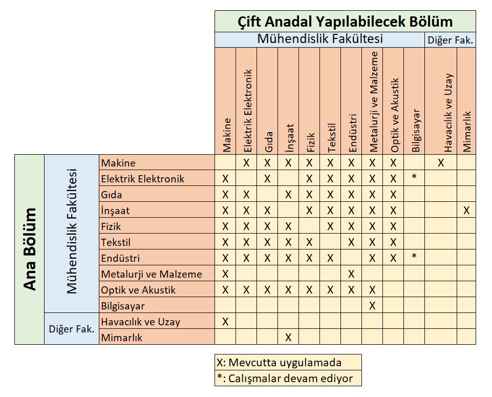 ÇİFT ANADAL VE YANDAL YAPILABİLECEK BÖLÜMLER