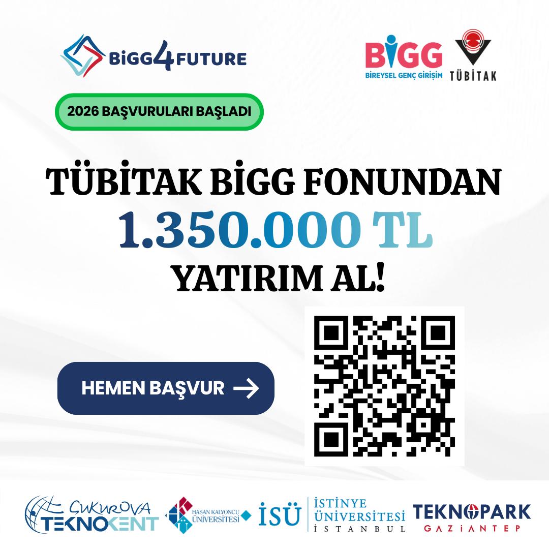 TÜBİTAK 1812 Yatırım Tabanlı Girişimcilik Destek Programı kapsamında yürütülen BiGG4FUTURE Programı ile yenilikçi fikirlerinizi, %3 hisse karşılığı tamamen geri ödemesiz 1 Milyon 350 Bin TL yatırım desteği, kapsamlı eğitim ve mentorluk fırsatlarıyla hayata geçirmeye davet ediyoruz.